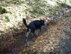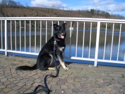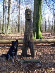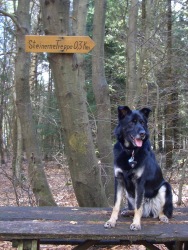 Ich möchte Euch hier von einer weiteren, tollen Sonntags-Kurzwanderung erzählen: Am 4. März 2007 bin ich mit Frauchen und ihren Eltern bei schönstem Wetter am Nonnweiler Stausee gestartet. Am See entlang musste ich noch an der Leine bleiben (Man (und Hund) darf in dem See nämlich leider nicht schwimmen). Als wir in den Wald kamen, durfte ich dann aber nach Hundeherzenslust toben. Am Wegrand verlief fast die ganze Zeit ein kleiner Bach, was mich ein bissel dafür entschädigt hat, dass ich nicht in den See durfte. Auf dem Bild seht Ihr mich ganz oben auf dem Hunnenring...puh, war das ein steiniger Anstieg! Der Hunnering wurde im 1. Jahrhundert vor Chr. von den Treverern erbaut. In Kriegszeiten bot der Ring Tieren und Menschen Schutz (hat Frauchens Dad auf einem Schild gelesen). Das kann man sich aber gut vorstellen, wenn man diesen riesigen Steinwall aus der Nähe sieht! Gleich daneben gab es einen Platz, auf dem man sehen und lesen konnte, wie die Menschen früher so gelebt haben. Mir hat der Platz super gefallen, weil Frauchen mit mir ganz viele, tolle Übungen auf und mit den Skulpturen und Steinbauten gemacht hat. Da haben mich sogar die anderen Leute (und Hunde) überhaupt nicht interessiert. Naja, Ihr bekommt ja auf den Bildern unten einen kleinen Eindruck von meinen Erlebnissen. Ich kann Euch nur sagen, dass ich abends ziemlich müde war... (sogar der kleine Mops-Rüde abends im Biergarten am Nachbartisch hat mich nicht mehr aus der Ruhe gebracht...).