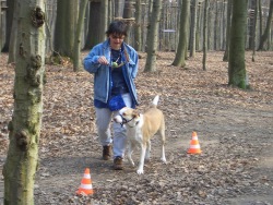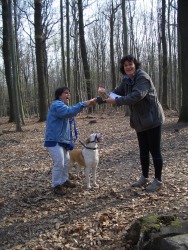 Am Dienstag, 3. April, haben wir unser Ostertraining in der Hundeschule gehabt. Sabine hat für Hunde und Frauchen einen kleinen Osterwettkampf mit Eierlauf, Slalom-Parcours, Eiersuche (das hat mir am besten gefallen, weil ich das Ei gleich fressen durfte!;-) und einer "Mutprobe" (Schlauchtunnel) organisiert. Stolze Sieger des Ostertrainings waren Jutta und Angelo. Den 2. Platz belegten Ricka und Senna. Quora und ich haben immerhin den 3. und 4. Platz (...von 4...) geschafft. Als Preis für alle gab es eine tolle Ostertüte mit Leckerchen für Hunde und Frauchen. Die waren fein!