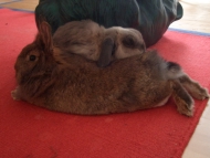 Franz (grauer Zwergwidder) und Lea (braunes Löwenköpfchen) sind die beiden Zwergkaninchen meines Frauchens. Die zwei sind genau wie ich aus dem Tierheim. Jetzt bewohnen die beiden Häschen sogar ein eigenes Zimmer, in dem sie überall herumhoppeln dürfen! Ich darf in dieses Zimmer nur in Begleitung meines Frauchens oder meines Herrchens. Das ärgert mich richtig! Noch dazu müssen die Hasen immer in ihren Stall, wenn ich ins "Hasenzimmer" komme. Dabei habe ich die beiden doch zum Fressen gern... Naja, anfangs haben mich die Häschen total fasziniert und ich habe immer den Stall anschauen müssen und jede Bewegung der Hasen registriert. Mittlerweile hat Frauchen mir ein Kissen in das Hasenzimmer gelegt, auf das ich mich auch brav lege, wenn Frauchen das will ... [Natürlich nicht, ohne vorher noch die Hasenköttel vom Teppich wegzufuttern. Das mache ich natürlich nur, damit Frauchen nicht staubsaugen muss;-)]