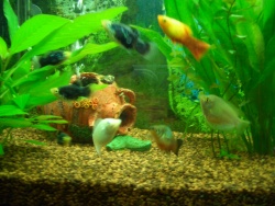 ... und die Fische...Ja, neben den Hasen sind da noch die Fische ("die Flossler"). Das Aquarium steht bei Frauchen und Herrchen im Wohnzimmer. Mich interessiert an den Fischen eigentlich nur das leckere Fischfutter. Ich sitze jeden Abend, wenn Frauchen die Fische füttert, neben ihr und hoffe, dass etwas Futter auf den Boden fällt. Das lecke ich dann natürlich sofort auf...schmeckt aber auch zu fein!
